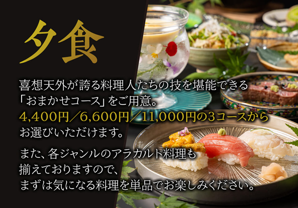 和・洋・中それぞれのジャンルを極めた専任シェフが腕をふるい、多彩なお料理をお届けしています。