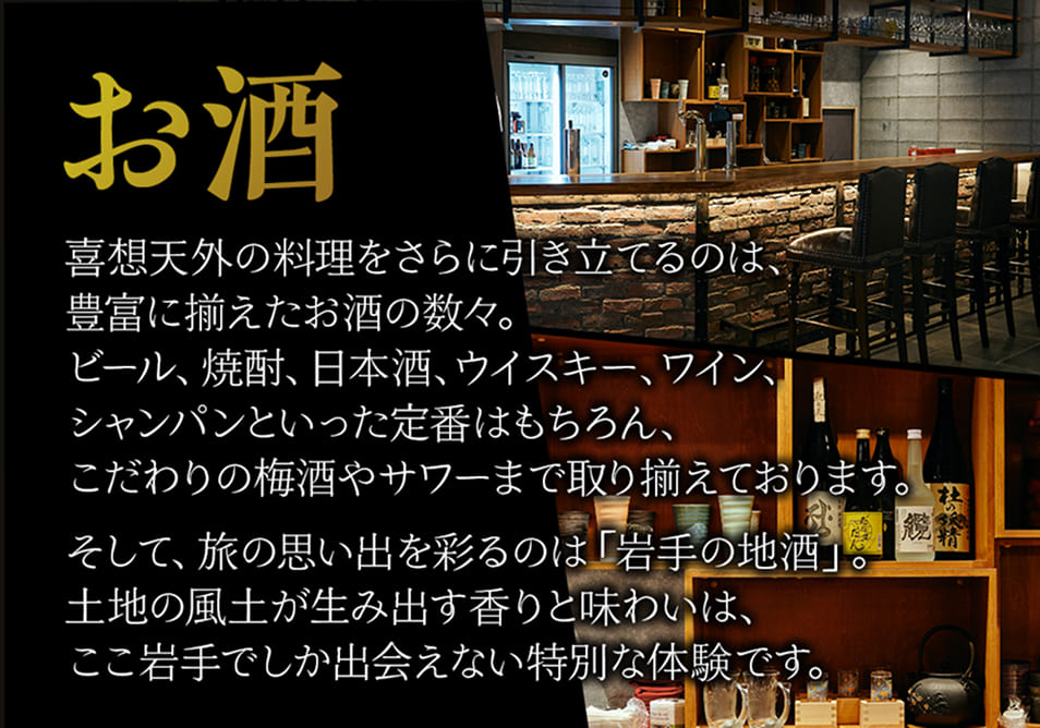 料理に合わせるのは、岩手の地酒をはじめ、ワイン、焼酎、ウイスキーなど豊富なお酒。